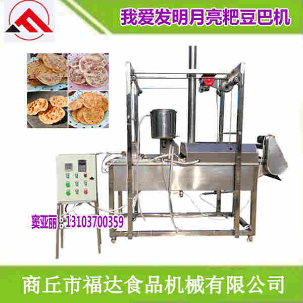 全自动月亮粑机器自动注浆,自动撒豆,自动成型,自动油炸,自动出料,自动清渣。 自动注浆:可以调节大小计量,定做出大小不同、厚度不同的产品;自动撒豆,可撒黄豆 花生米 瓜子 芝麻等,撒豆的数量也可以调节,不会出现数量明显不一样的情况。设备速度也可以调节。自动成型后,自动进入油炸锅油炸,自动控温,且油炸时间可调。 自动脱膜,成型效果好,模具可更换。这个是非常成熟的技术,目前公司生产的是第五代豆粑机,央视《我爱发明》拍摄需要,把一代二代机整合成一代机,三代机和四代机整合成二代机,五代机为五代机。另外油炸过程中不会飘起。